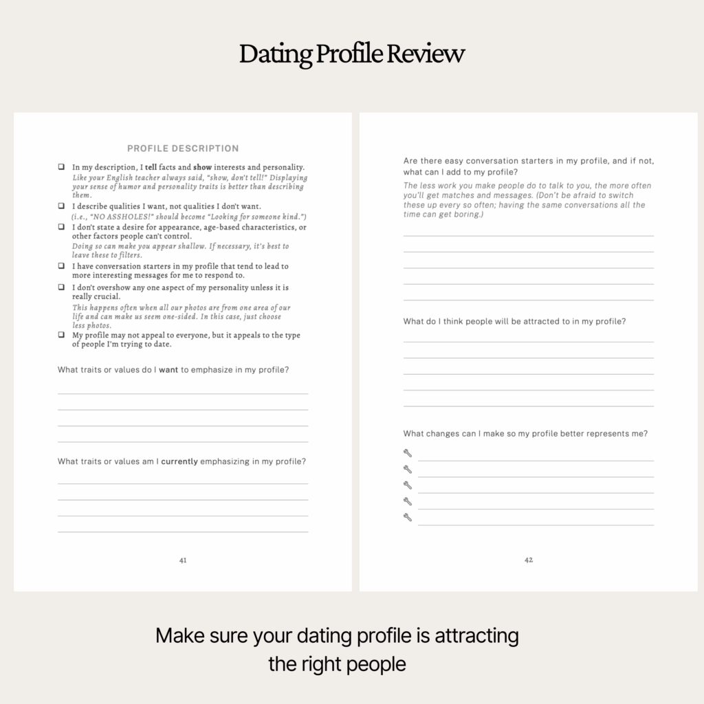 Finding the right app is just the first step. While these platforms can connect you with potential matches, fostering a genuine connection requires deeper self-awareness and intention. That’s where our guided dating journal comes in. It’s designed to help you clarify what you’re truly looking for, reflect on your dating experiences, and build the confidence to navigate the online dating world with purpose.